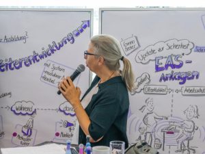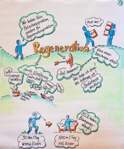 Als Zeichnerin kann ich Ihre Veranstaltung „am Spielfeldrand“ begleiten und ein inspirierendes visuelles Protokoll abliefern – ohne dabei ein Wort zu sprechen. Wenn Sie mehr wollen: Ich kann das Graphic Recording im Plenum präsentieren und kommentieren, wodurch eine lebendige und kurzweilige Zusammenfassung entsteht. So haben die Teilnehmenden die Möglichkeit, den Prozess zu reflektieren und zu vertiefen – entweder als Abschluss oder als Übergang zwischen den verschiedenen Phasen.