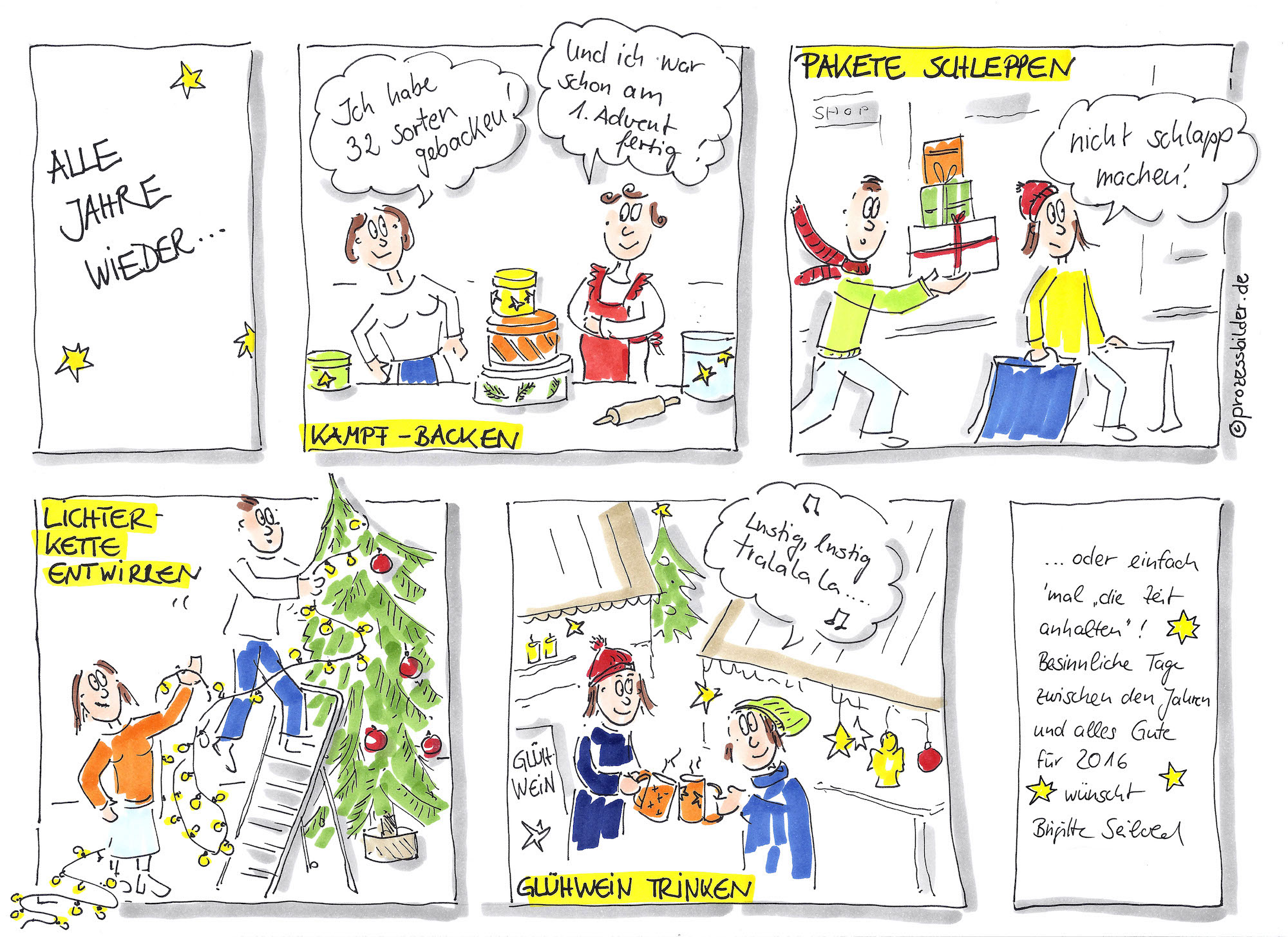 Plätzchen backen, Pakete schleppen, Lichterkette entwirren (sie sind IMMER verknotet), auf dem Weihnachtsmarkt (schlechten) Glühwein trinken mit den Kolleg*innen …